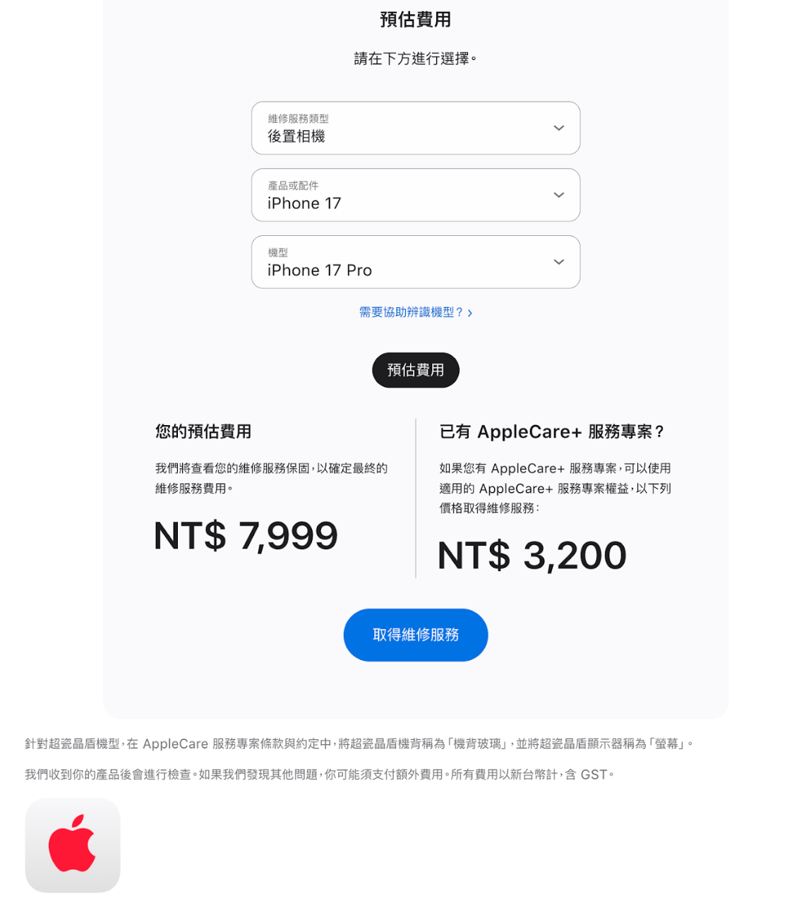 • 維修代價高昂: iPhone 17 Pro 的鏡頭模組維修費用預估就要NT$7,999,超過全新機的四分一的價格。