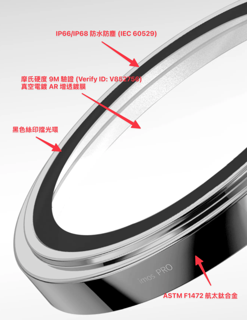 - imos 採用 ISO 6769 國際標準的藍寶石玻璃,硬度達 9M 摩氏等級(僅次於鑽石)。